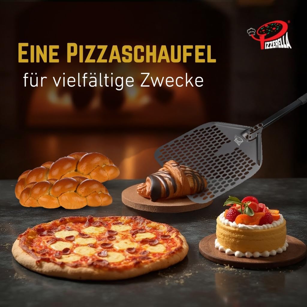 PIZZERELLA® Premium Pizzaschieber mit Gratis Pizzaschneider - 30 x 35,5 x 66 cm cm Perforierte Schaufel aus Harteloxiertem Aluminium -Rechteckige Profi-Schaufel mit Verlängertem Silikongriff